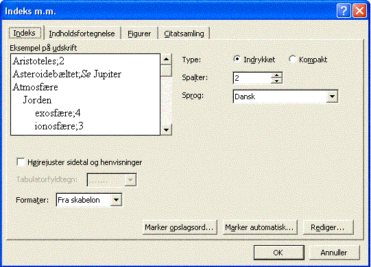 Vælg Indsæt -> Reference -> Index m.m. i menulinjen. Herved fremkommer denne dialogboks: